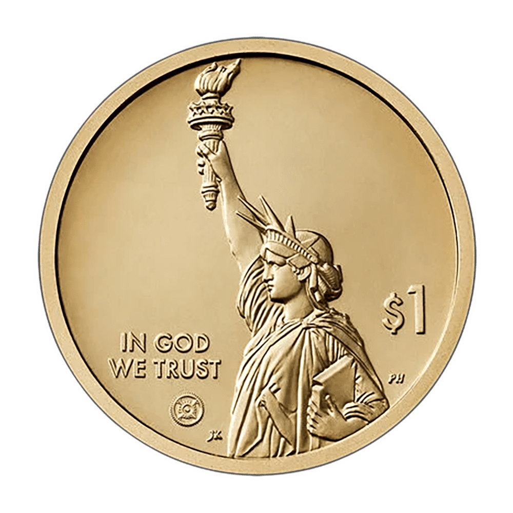 The obverse (heads) of the coin features a bold and elegant profile of the Statue of Liberty, symbolizing freedom, opportunity, and innovation. This side also includes a privy mark in the shape of a stylized gear, representing the spirit of industry and technological advancement that defines the American Innovation series.
