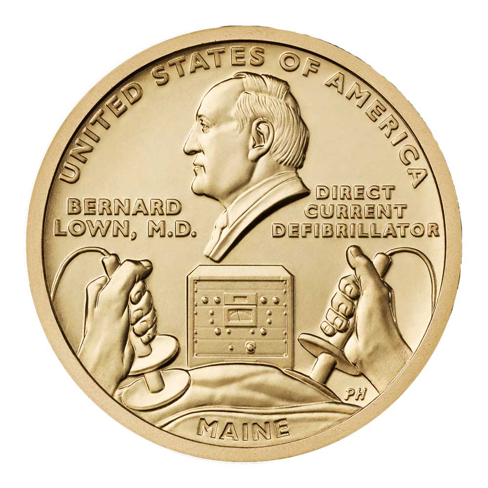 The 2024 American Innovation $1 Coin representing Maine pays tribute to Dr. Bernard Lown, a pioneering cardiologist whose invention of the direct current defibrillator revolutionized cardiac care and saved countless lives. This coin is part of the American Innovation $1 Coin Program, which celebrates groundbreaking innovations and inventors from each U.S. state and territory.