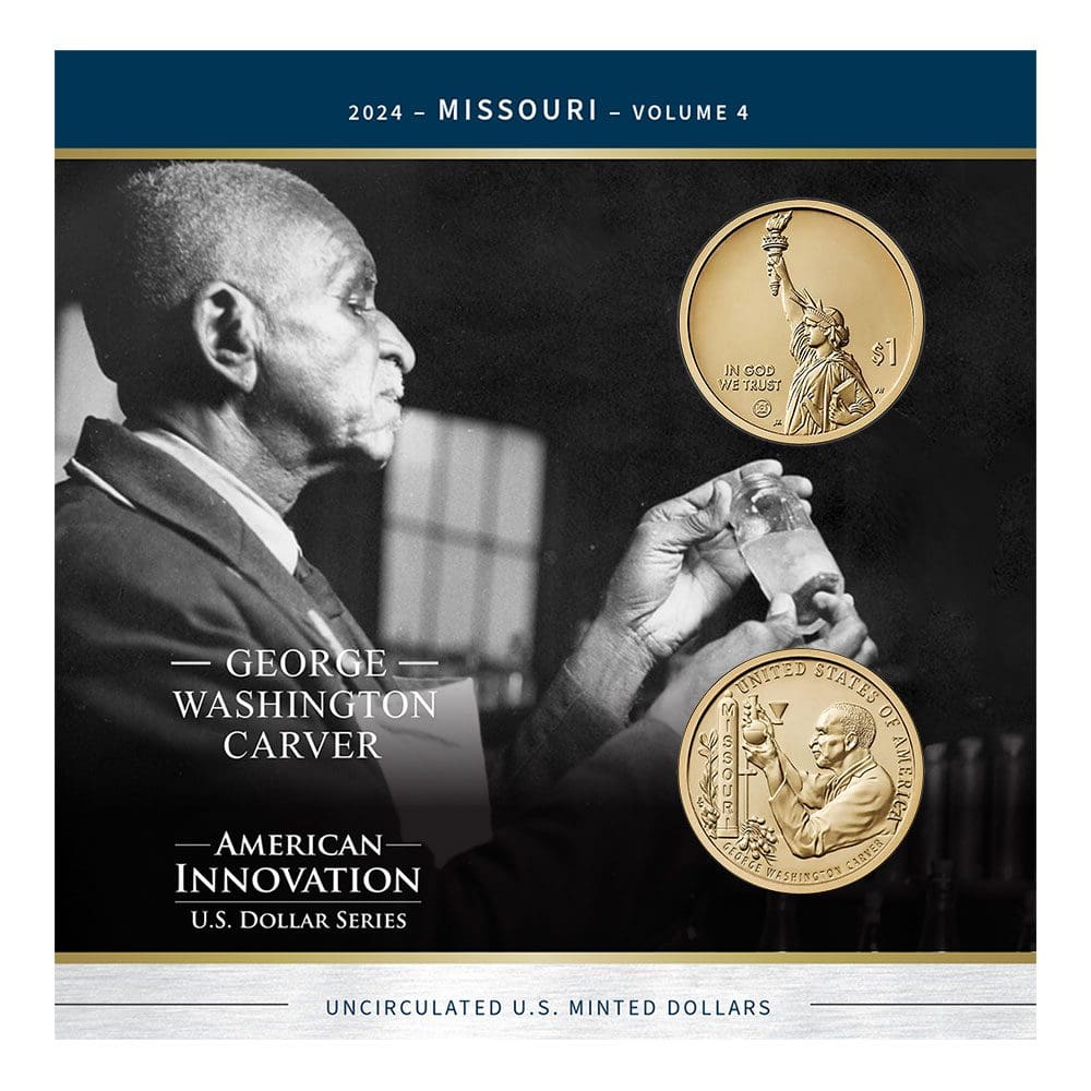 The 2024 American Innovation $1 Coin for Missouri honors George Washington Carver, a pioneering agricultural scientist, inventor, educator, and humanitarian whose work transformed farming practices and uplifted generations of Americans. This commemorative coin is part of the American Innovation $1 Coin Program, which celebrates innovation and ingenuity across all U.S. states and territories.