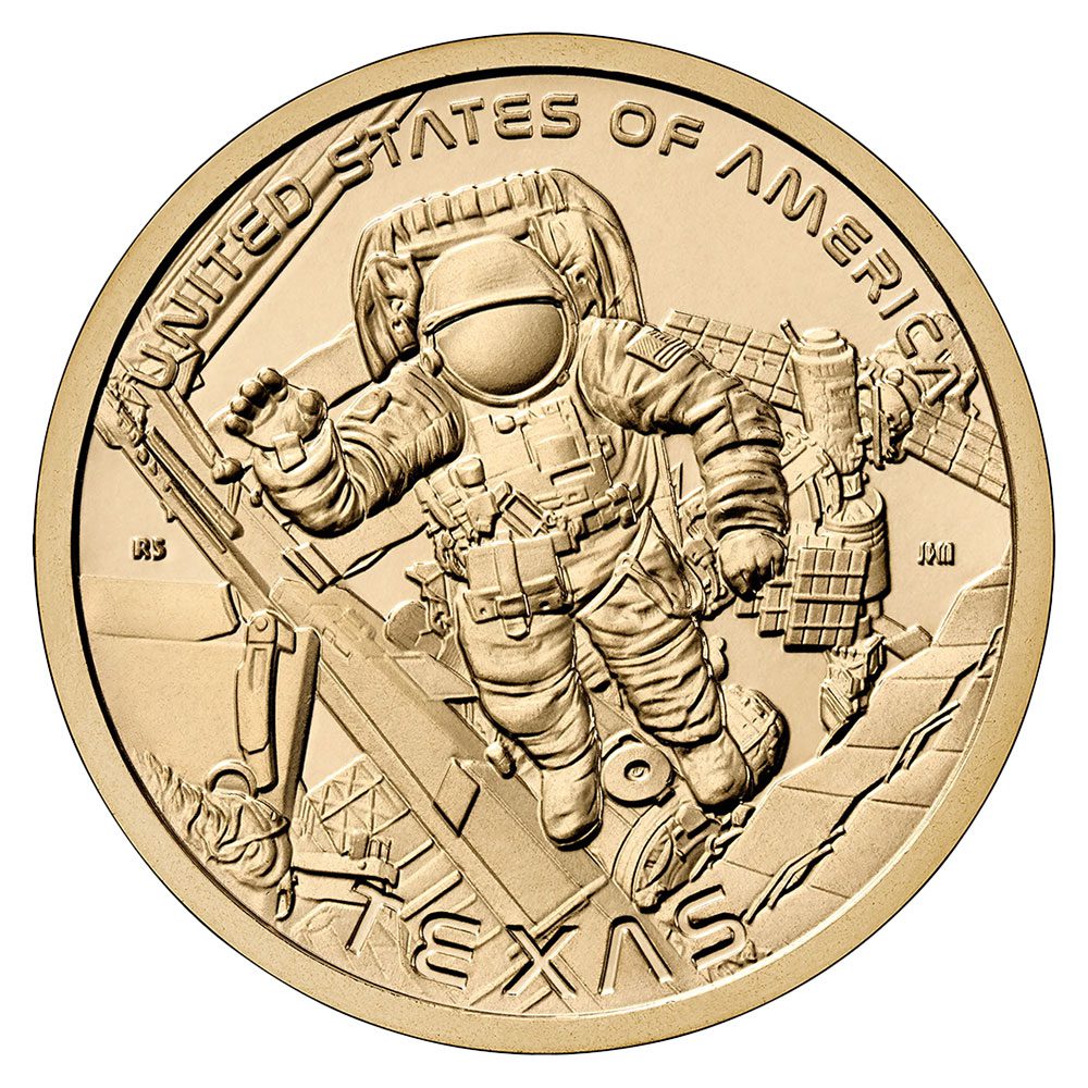 The Texas American Innovation $1 Coin reverse (tails) design features an American astronaut conducting a spacewalk outside the International Space Station. The image represents the culmination of the Mission Control Center’s economic, logistical, and intellectual support for NASA’s human space program, as well as its support of astronauts from the many countries that participate in the International Space Station program. Included inscriptions are “UNITED STATES OF AMERICA” and “TEXAS.”