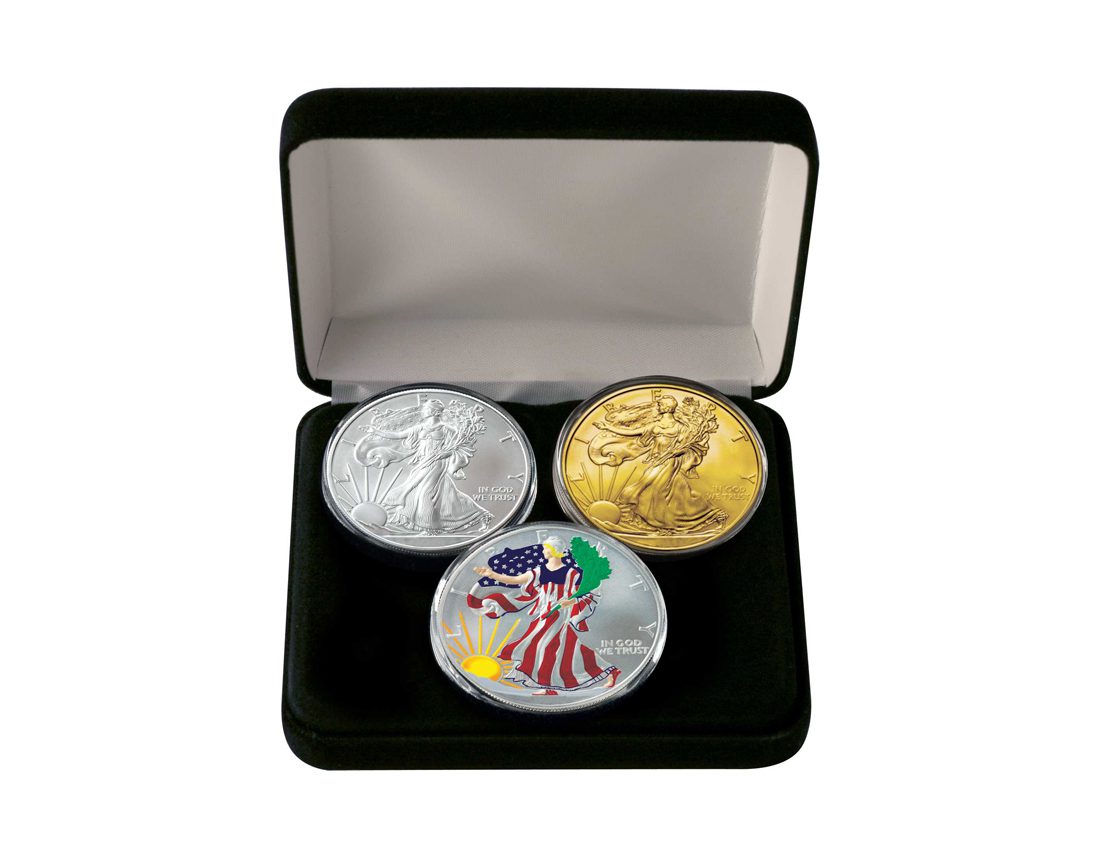 This unique set contains three uncirculated American Eagle Coins: a 2025 Silver American Eagle, a 2025 gold-plated Silver American Eagle and a 2025 Colorized Silver American Eagle. Each contains one troy ounce of .999 fine silver.
