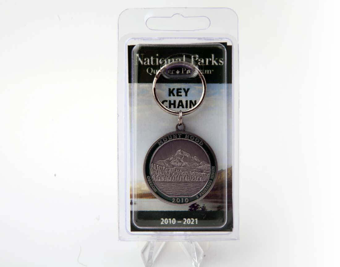 This oversized replica Mount Hood National Forest quarter key chain is a durable and colorful tribute to one of the most beautiful and inspiration sites in America as part of the National Parks Quarter Program. This antiqued nickel key chain is carefully sculpted to fully accentuate the details and beauty of the circulating quarters. The split-ring key chain has a 1.5″ diameter. The Reverse of this key chain is a brilliant American flag circled by the reminder that these sites belong to us all as well as the originality of the national park concept as being uniquely American. Collect your favorites or collect them all to create a complete collection.