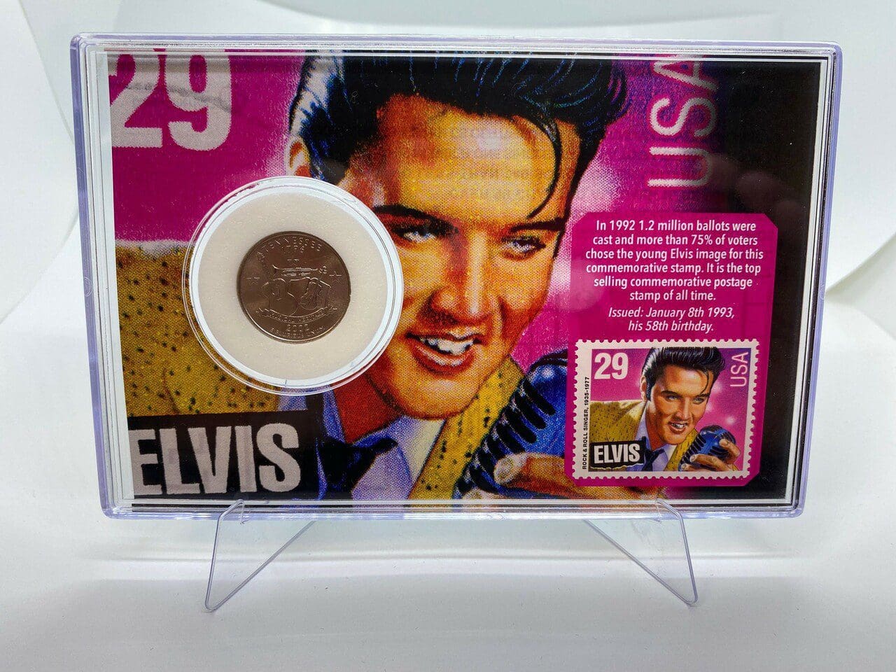 Long live the King of Rock N’ Roll! This Elvis Presley acrylic set features an uncirculated,  2002 Tennessee State Quarter and a 29 cent U.S. postage stamp featuring Elvis himself. This stamp continues to be the most popular stamp of all time with more than 124 million collected!