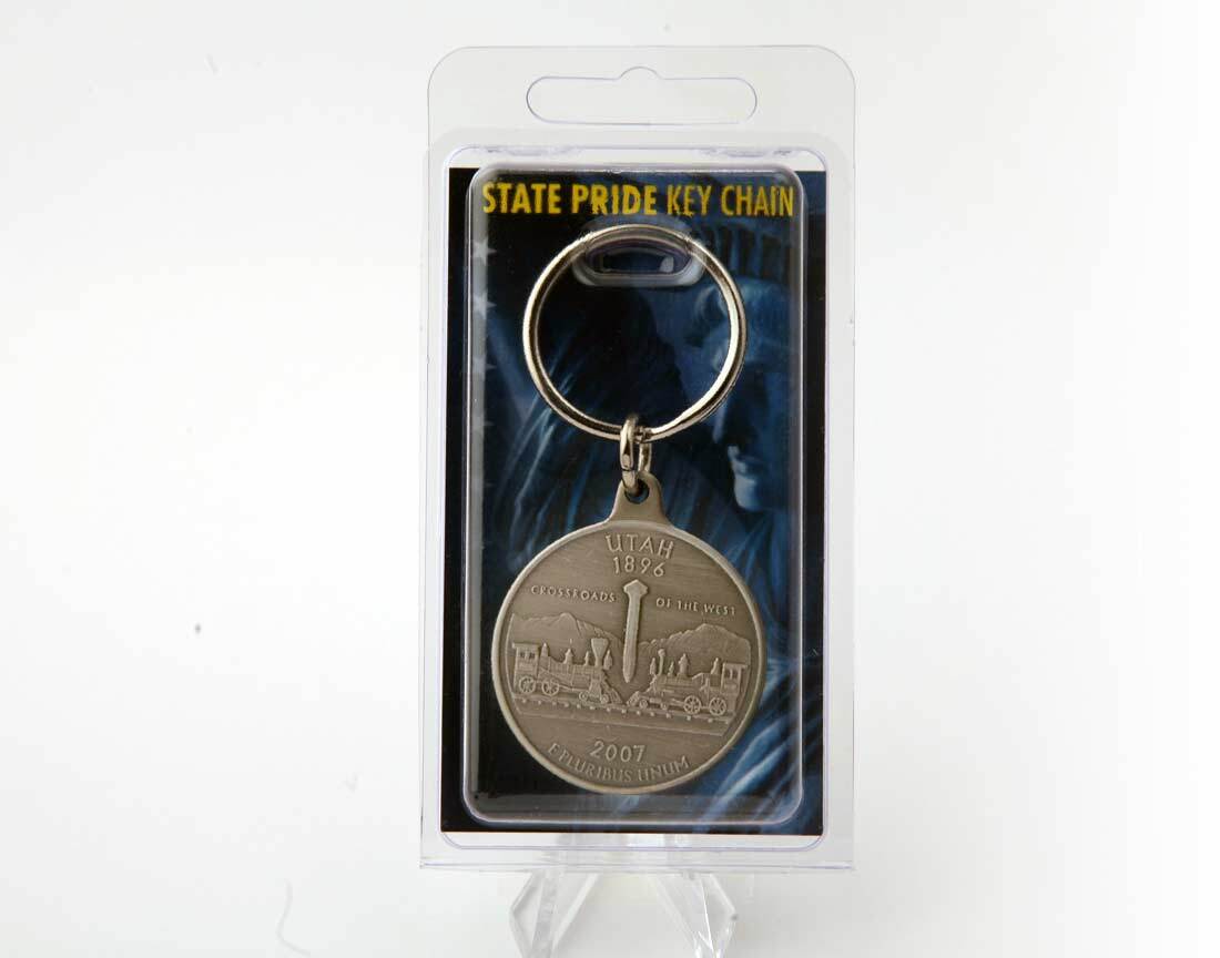 This durable split ring keychain features an oversize replica of the Utah State Quarter crafted in antiqued nickel silver. This novel oversized design proudly displays all of the details in this great quarter design.
