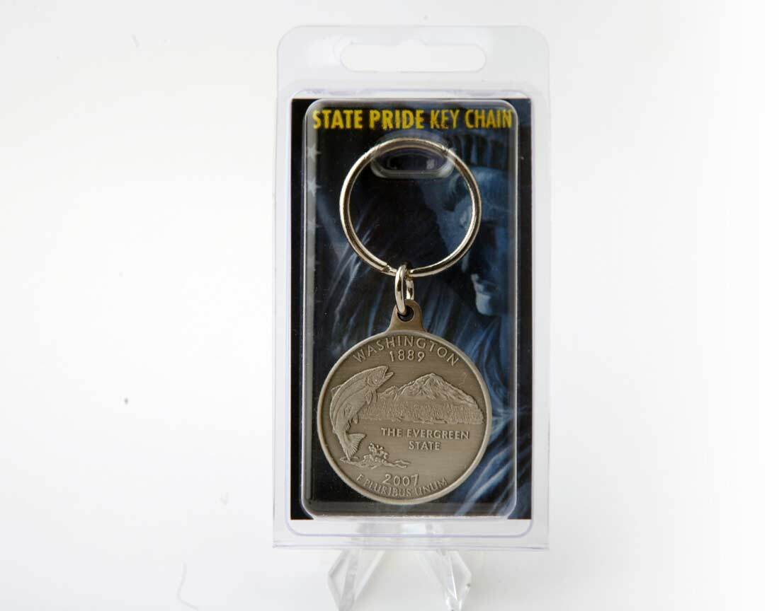 This durable split ring keychain features an oversize replica of the Washington State Quarter crafted in antiqued nickel silver. This novel oversized design proudly displays all of the details in this great quarter design.