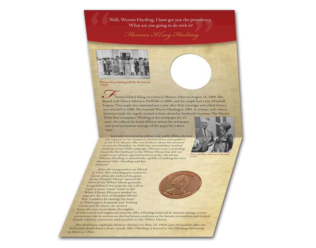 The Florence Kling Harding commemorative copper coin collection is a great way to honor the first lady of Warren G. Harding. This collection commemorates the first lady during her husband’s term in office as the 29th President of the United States. The First Lady Collections are full color and are a great way to collect the commemorative coins along with fascinating art and historical information.