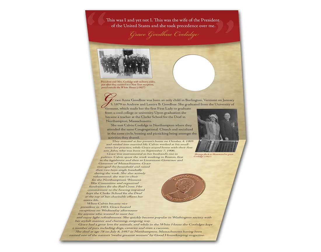The Grace Coolidge commemorative copper coin collection is a great way to honor the first lady of Calvin Coolidge. This collection commemorates the first lady during her husband’s term in office as the 30th President of the United States. The First Lady Collections are full color and are a great way to collect the commemorative coins along with fascinating art and historical information.