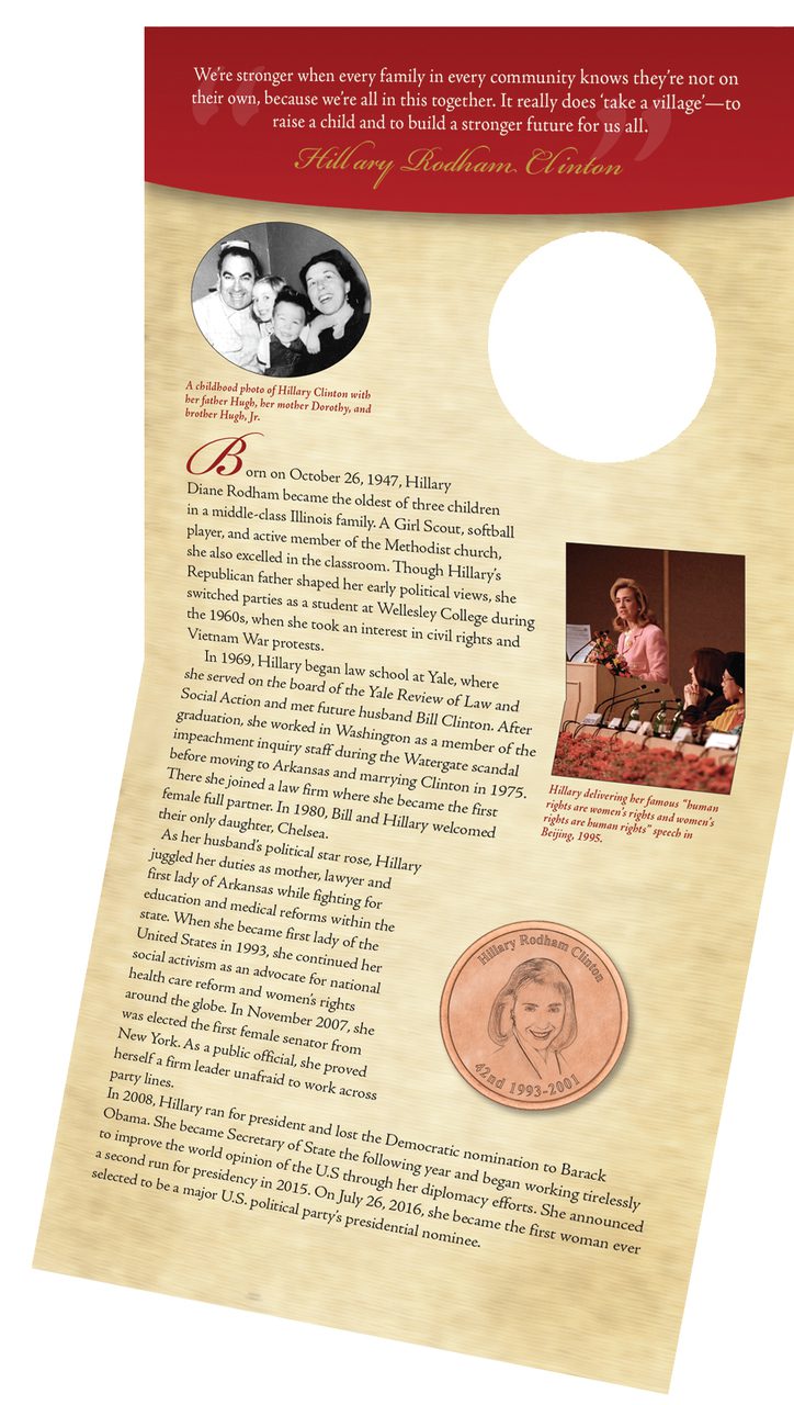 The Hillary Clinton commemorative copper coin collection is a great way to honor the first lady of Bill Clinton. This collection commemorates the first lady during her husband’s term in office as the 42nd President of the United States. The First Lady Collections are full color and are a great way to collect the commemorative coins along with fascinating art and historical information.
