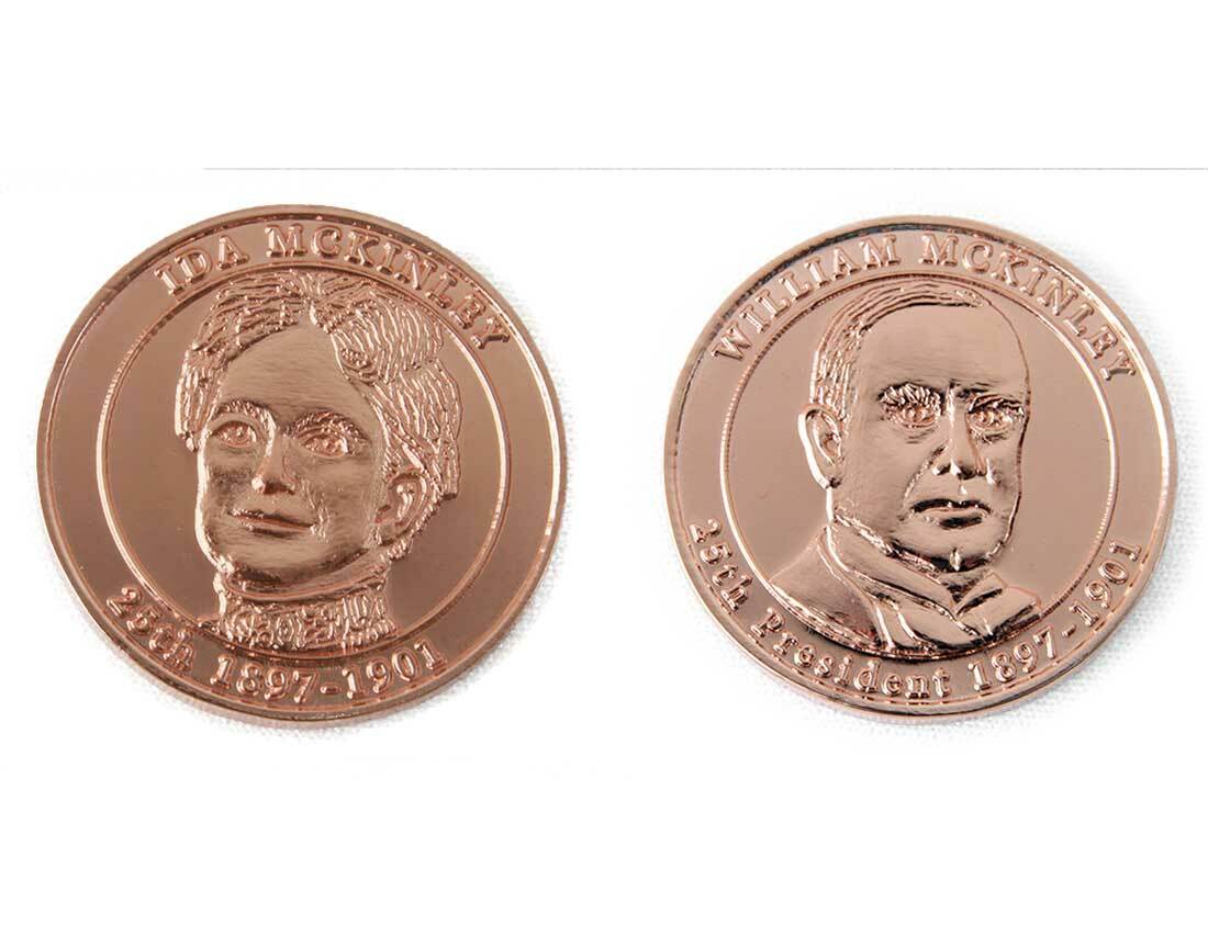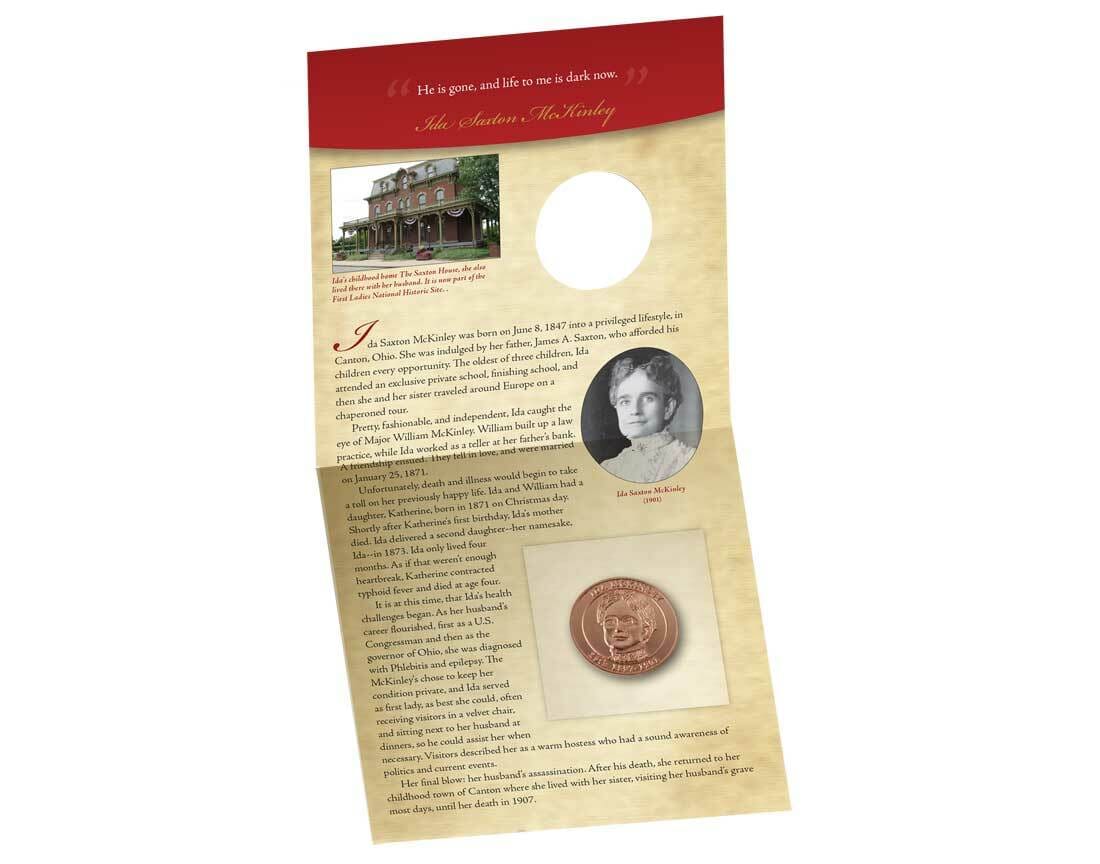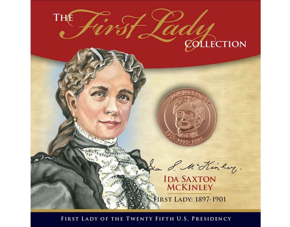 The Ida Saxton McKinley commemorative copper coin collection is a great way to honor the first lady of William McKinley. This collection commemorates the first lady during her husband’s term in office as the 25th President of the United States. The First Lady Collections are full color and are a great way to collect the commemorative coins along with fascinating art and historical information.