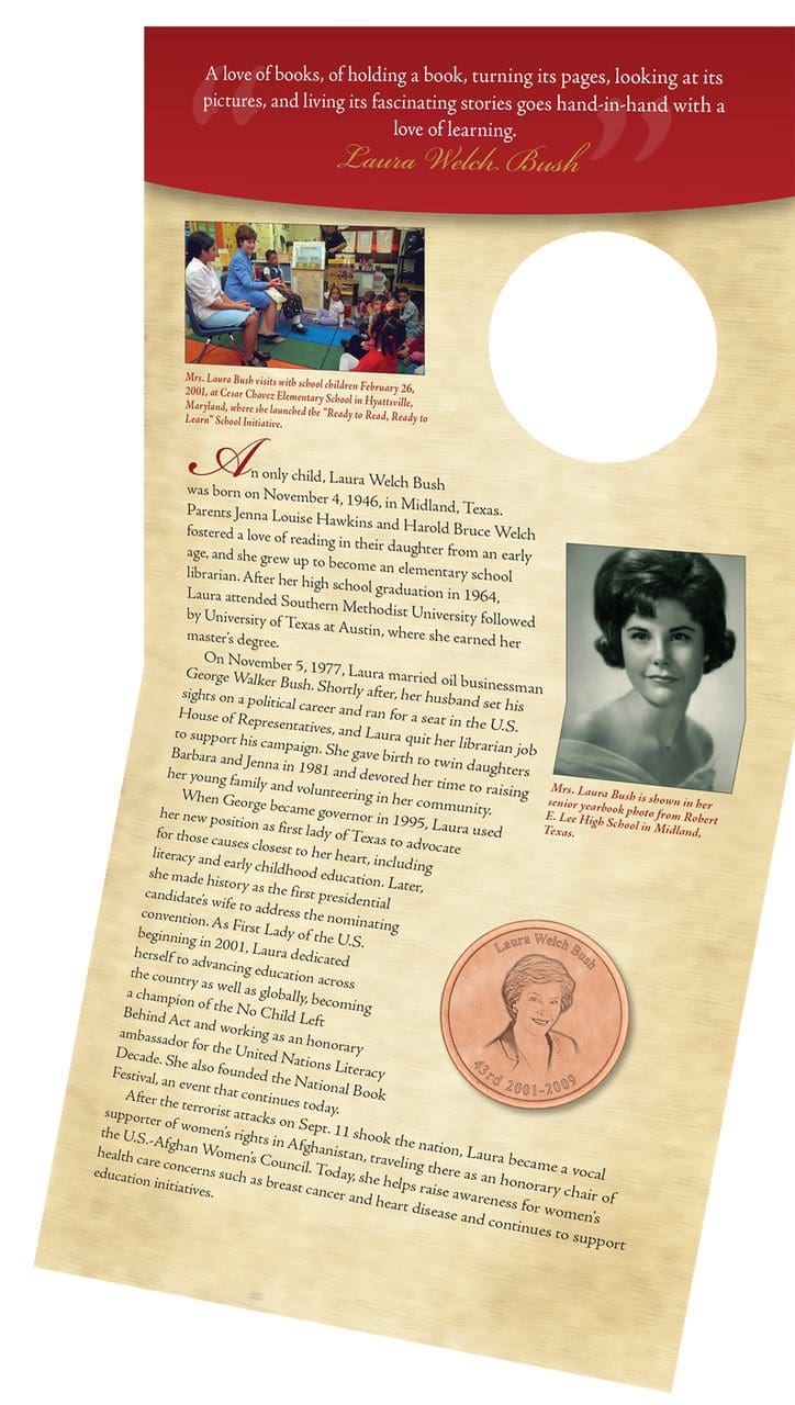 The Laura Bush commemorative copper coin collection is a great way to honor the first lady of George W. Bush. This collection commemorates the first lady during her husband’s term in office as the 43rd President of the United States. The First Lady Collections are full color and are a great way to collect the commemorative coins along with fascinating art and historical information.