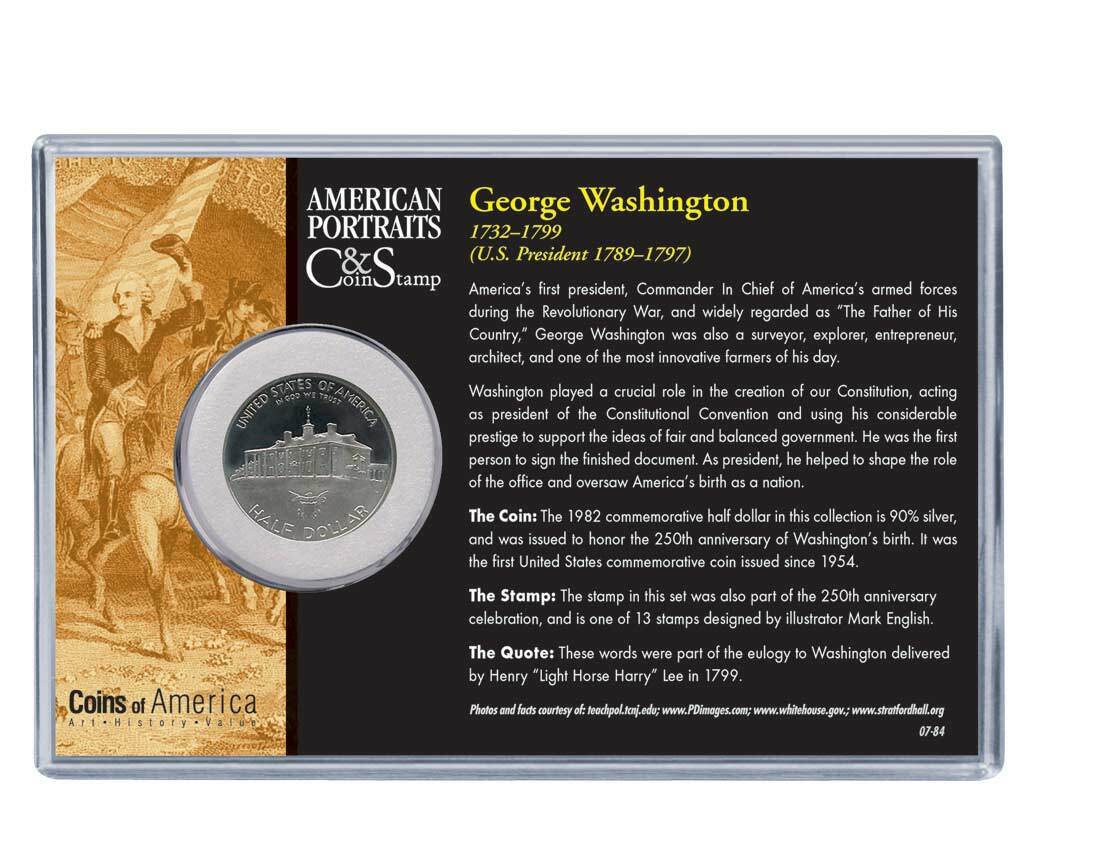 The coin in this set is a 1982 Commemorative 90% Silver Half Dollar. It was issued to commemorate the 250th anniversary of the birth of our first president. The stamp was also issued in 1982 and features Washington along with an early American flag. The backdrop is a montage of the Constitution and images of Washington the soldier.