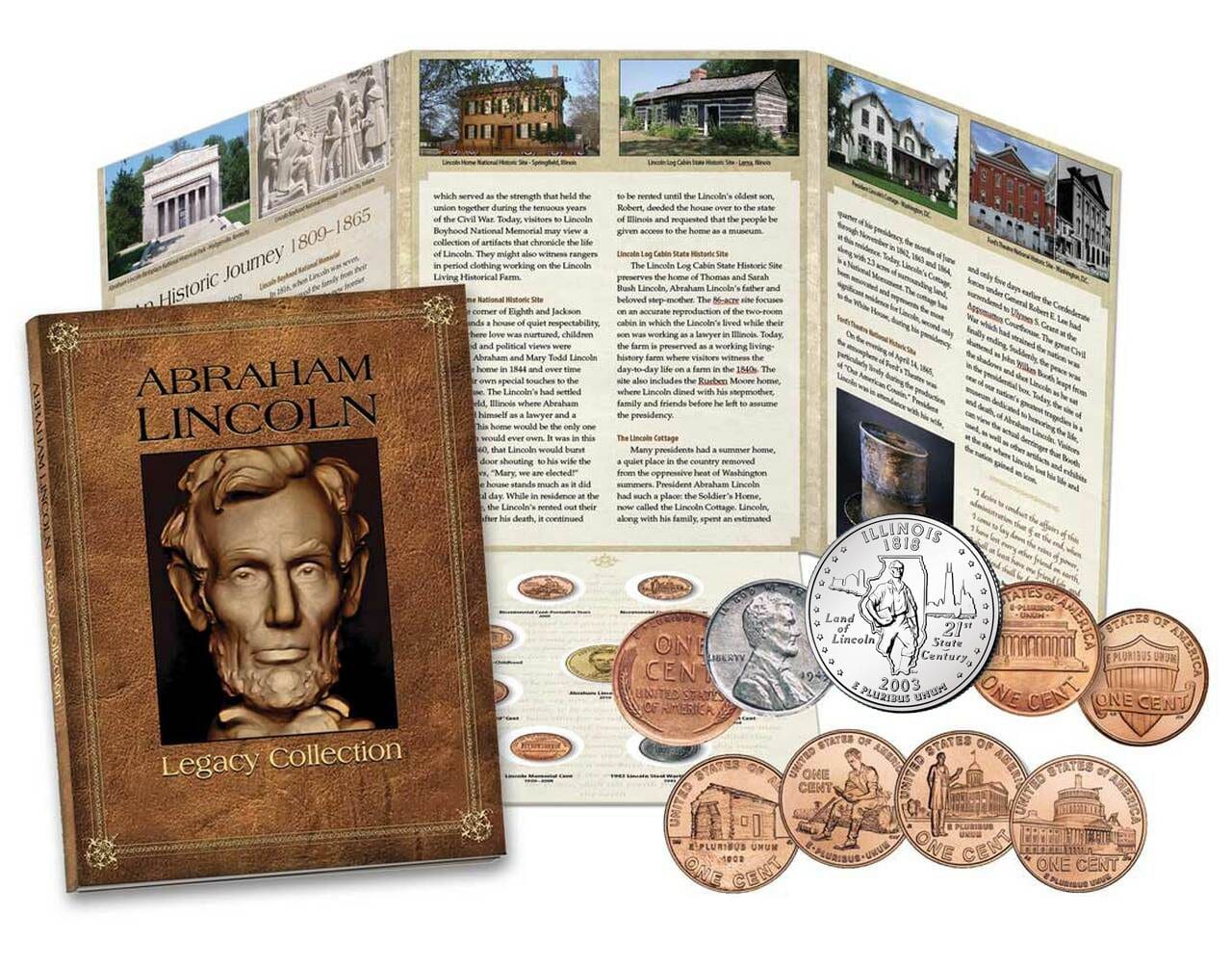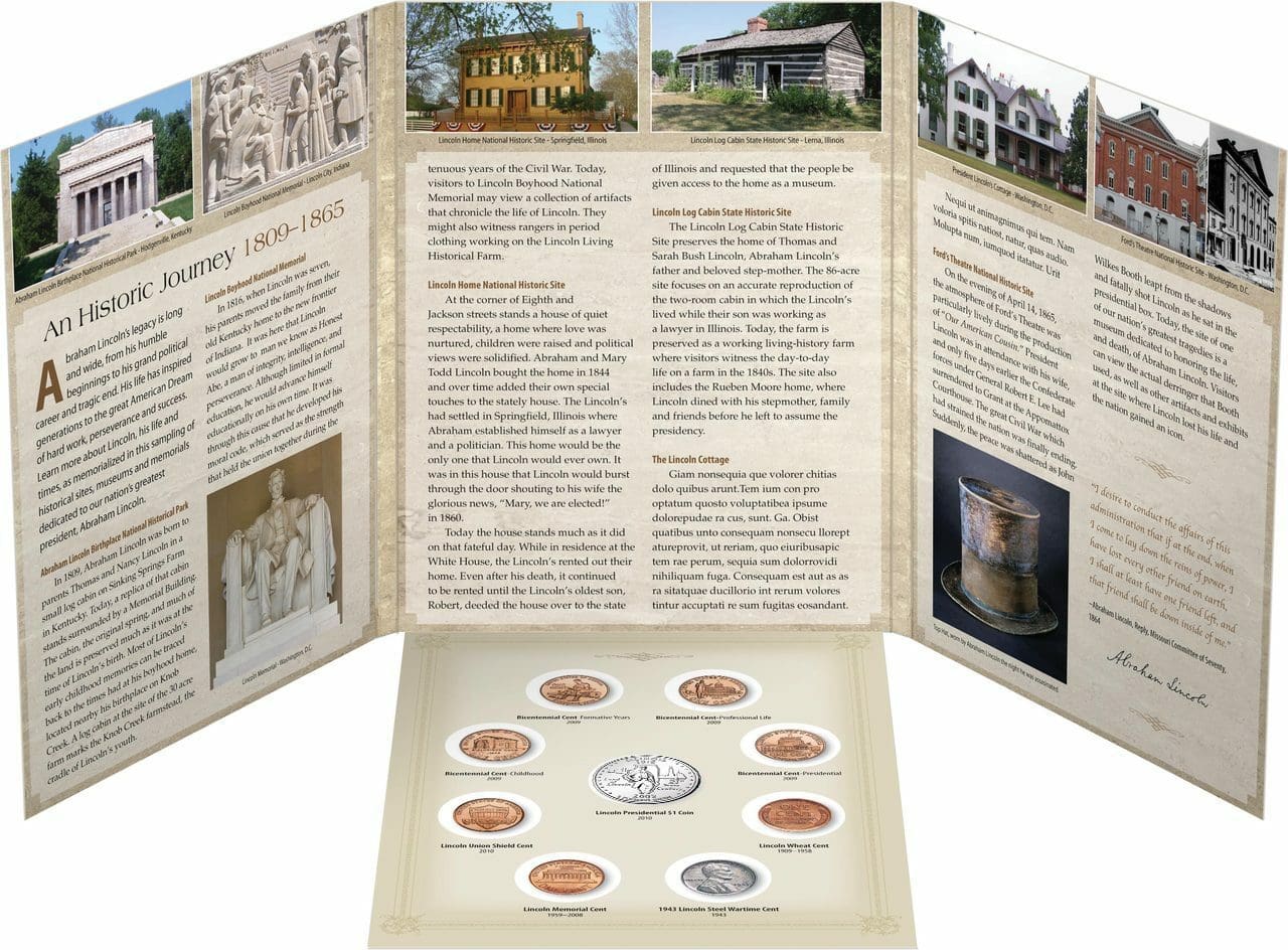 This collection features 9 coins spanning more than 100 years of Lincoln history on U.S. coins. President Lincoln was the first president to be featured on a circulating coin, the first to be featured on both the obverse and reverse of the same coin, and he is an American icon like no other. We’ve surrounded the 2003 Illinois state quarter, with 8 historically significant coins all featuring Lincoln. – The Lincoln Wheat Cent – The “War Penny” – The Lincoln Memorial Cent – All 4 bicentennial 2009 Lincoln Cents (Uncirculated) – The 2010 Shield Cent (Uncirculated) Includes a parchment copy of the Gettysburg Address, given on November 19th, 1863. These beautifully showcased coins are set in the context of featured memorials and sites throughout Lincoln’s history. Everything from his humble log cabin beginnings, to the Lincoln Memorial to his Presidential Library.