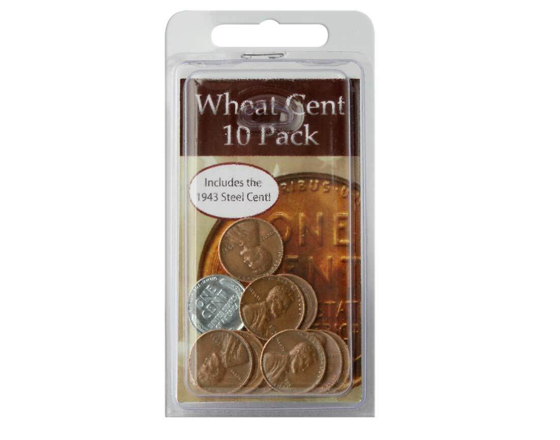 • Wheat Cent Pack: Contains 9 authentic Wheat Cents and 1 Wartime Steel Cent from 1943. Wheat Cents will vary in year from 1909 to 1958, giving you a range of coins that span nearly five decades of American history.