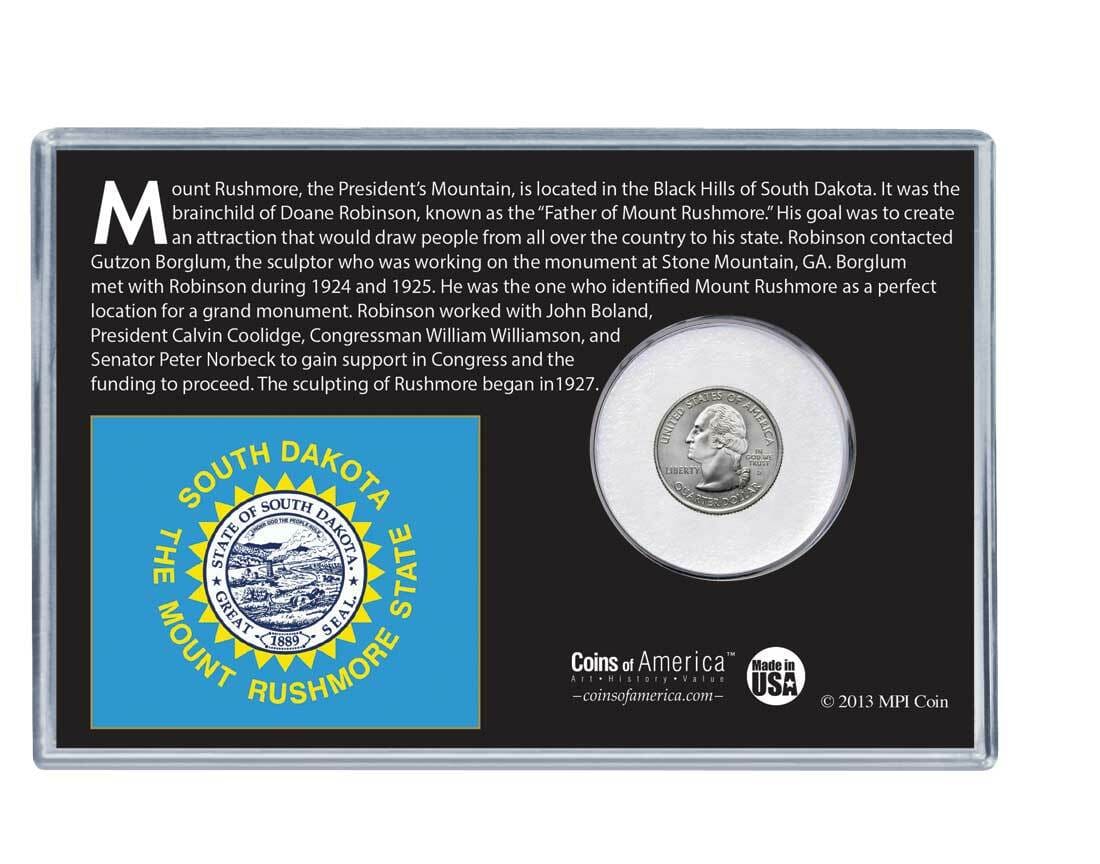 The Mount Rushmore National Memorial is the epitome of American spirit and ingenuity made everlasting in a granite masterpiece. Coins of America is paying homage to this National treasure with our latest coin and stamp series. Learn why the Black Hills were chosen to host Mount Rushmore with this set, which contains one brilliant uncirculated 2006 South Dakota Quarter and one vintage unused postage stamp. Collect all six in the series and display your American spirit and pride.