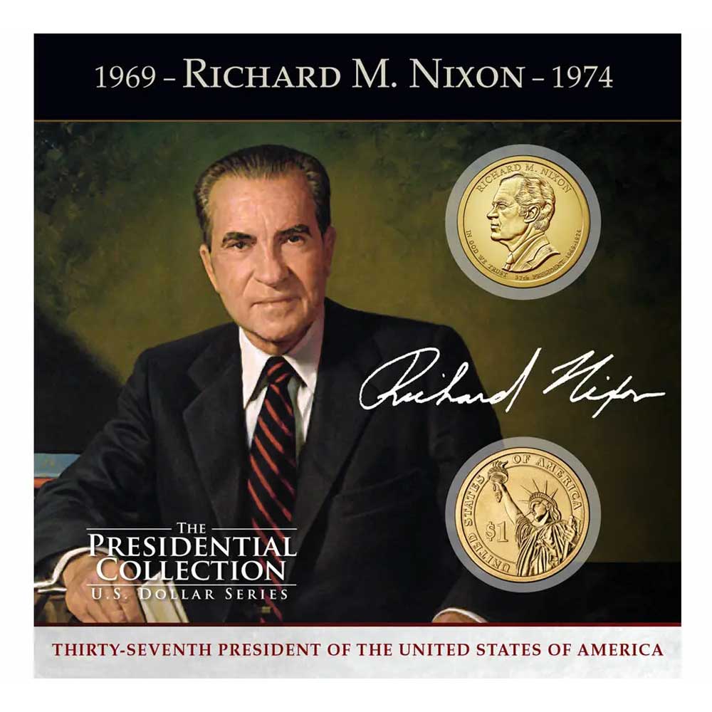 Featured on the obverse of the Richard M. Nixon coin is a likeness of Richard M. Nixon along with the inscriptions “In God We Trust”, “37th President” and “1969-1974.” The reverse features a striking rendition of the Statue of Liberty with the inscriptions “United States of America” and “$1.” The coin also features edge-infused inscriptions.
