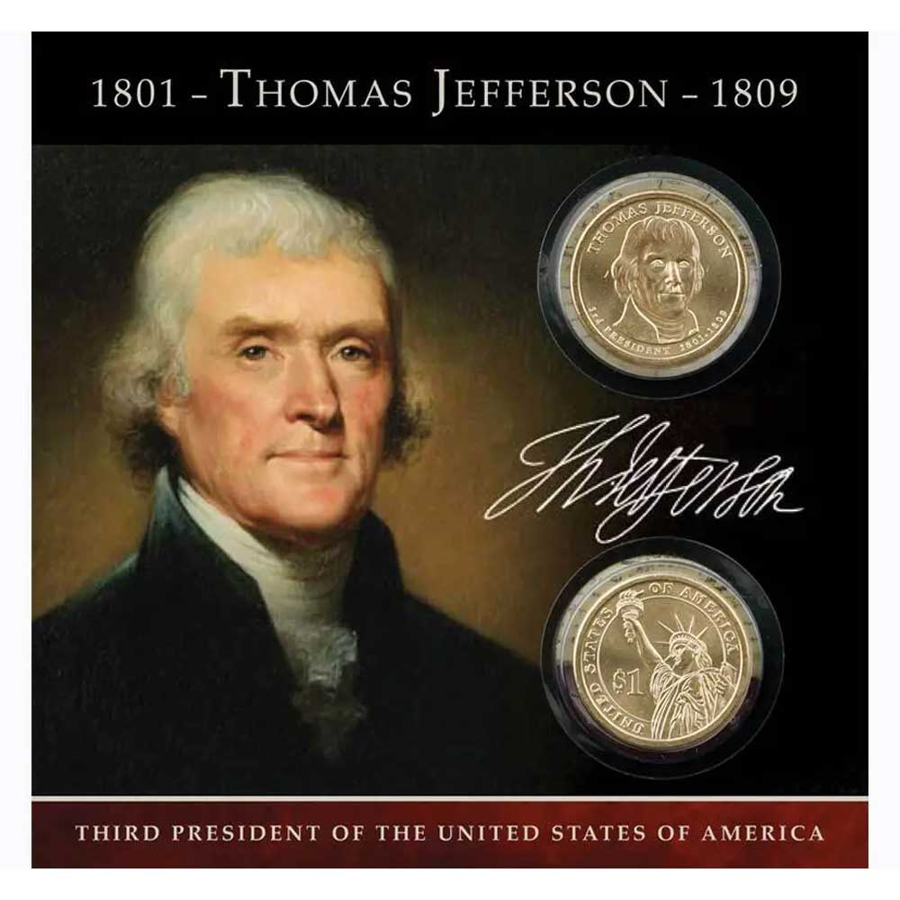 Featured on the obverse of the Thomas Jefferson dollar coin is a likeness of Thomas Jefferson along with the inscriptions “3rd President” and “1801-1809.” The reverse features a striking rendition of the Statue of Liberty with the inscriptions “United States of America” and “$1.” The coin also features edge-incused inscriptions.