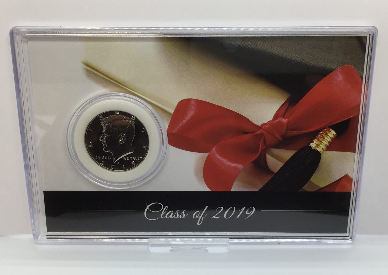 A great gift for any graduate. Commemorate the special occasion with this unique keepsake featuring an uncirculated Kennedy Half Dollar. Insert can be customized for a personal message.  A current year Kennedy have dollar will be inserted unless otherwise requested.