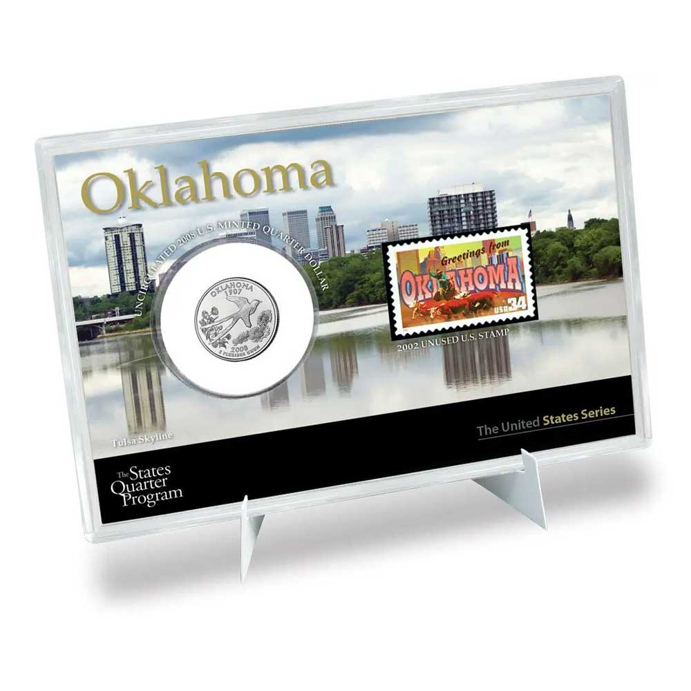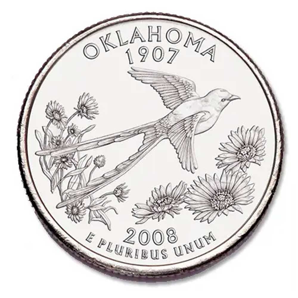 The Oklahoma Quarter features several Indian blanket blooms in the foreground, backed by a field of similar wildflowers. Above the field is the Oklahoma state bird, the scissortail flycatcher, in flight with tail feathers spread. The coin also bears the inscriptions “Oklahoma” and “2008.”